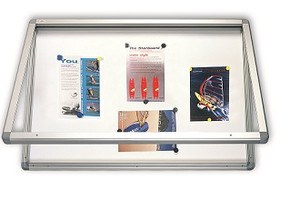 Przeznaczona do użytku również na zewnątrz budynku. Rama aluminiowa. Drzwiczki ze szkła ESG o dużej wytrzymałości, zamykane na kluczyk. Tył gabloty wzmocniony blachą ocynkowaną. Powierzchnie: korkowa, tekstylna lub suchościeralno-magnetyczna lakierowana.  W zestawie elementy mocujące.